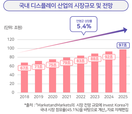 ○ 국내 디스플레이 시장규모는 2018년 67조 8,253억 원에 2025년 97조 9,644억 원으로 연평균 5.4%의 성장률을 보일 것으로 전망