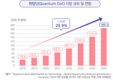 ○ 세계 양자점(Quantum Dot, QD) 시장 규모는 2018년 29억 8천만 달러에서 29.9%의 성장률로 2025년 186억 4천만 달러 규모를 형성할 것으로 전망됨