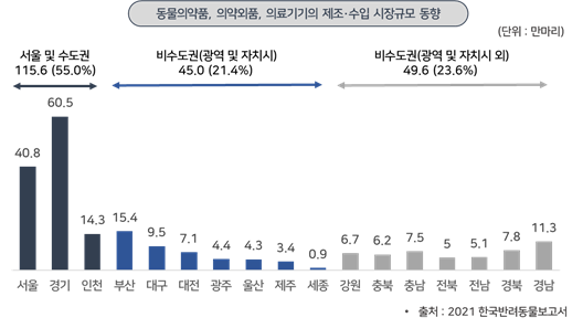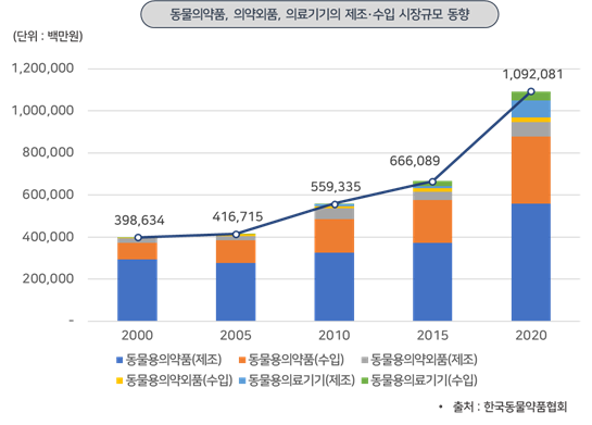 - 2020년 말 기준, 동물용의약품 제조 규모는 약 5,594억원, 동물용의약품 수입 규모는 약 3,190억원, 동물용의약외품 제조 규모는 약 674억원, 동물용의약외품 수입 규모는 약 227억원으로 조사됨