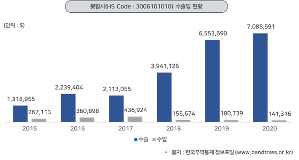 ◯ 2015년부터 2020년까지 HS Code 3006101010 분야의 수출입 통계를 조사한 결과, 일본 대상 수출 및 수입이 가장 큰 비중을 차지하고 있음