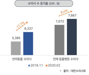 - 2018년 11월과 2020년 2월 기준 수의사는 8.4%(595명) 증가하였으며, 반려동물병원 수의사는 17.7%(952명)으로 크게 증가하였음