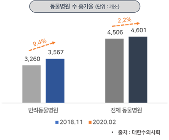 - 2018년 11월과 2020년 2월 기준 동물병원은 2.2%(98개소) 증가하였으며, 반려동물병원은 9.4%(307개소)로 증가하였음