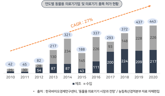 ㅇ 2021년 6월 한국바이오경제연구센터에서 발표한 ‘동물용 의료기기 시장과 전망’ 자료에 따르면, 2010년부터 2020년까지 동물용 의료기기의 제품 등록률이 증가하고 있으며 연평균 성장율은 27%로 나타내고 있음
