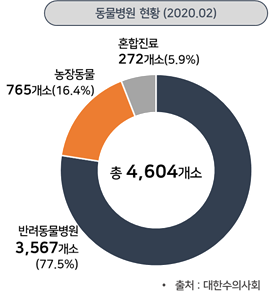 ㅇ 국내 동물병원 현황은 총 4,604개소로 조사되었으며, 반려동물병원이 3,567개소(77.5%), 농장동물 765개소(16.6%), 혼합진료 272개소(5.9%) 순으로 분포되고 있음