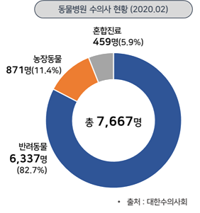 ㅇ 대한수의사회가 발표한 2020년 2월 기준 수의사 분포 현황에 따르면, 총 면허등록자는 20,649명으로 동물병원에 종사하고 있는 수의자 수는 총 7,667명(34.7%)로 조사됨