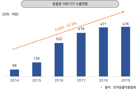 ㅇ 한국동물약품협회에 따르면, 국내 동물용 의료기기 수출 시장은 2014년부터 2019년까지 꾸준히 성장하여 연평균 47.6% 성장한 것으로 조사됨