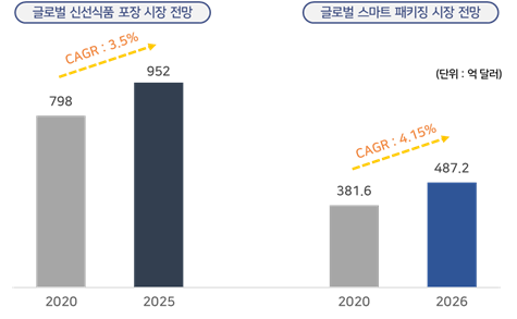 ㅇ 글로벌 신선식품 포장 시장 규모는 2020년 798억 달러에서 2025년 952억 달러 규모로 성장할 것으로 전망 (CAGR : 3.5%)