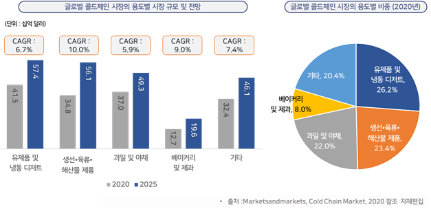 ㅇ 2020년 Marketsandmarkets에서 발표한 ‘Cold Chain Market’ 자료에 따르면, 유제품 및 냉동 디저트류가 26.2%의 점유율을 차지하고 있으며, 생선·육류·해산물 제품, 과일 및 야채, 베이커리 및 제과, 기타 순으로 비중을 나타내고 있음