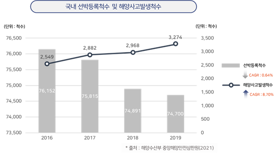 ◯ 해양수산부 중앙해양안전심판원에서 2021년 3월 발간한 “2020년 해양사고 통계”에 따르면, 2016년 이후 선박등록척수는 감소하는 추세이나, 해양사고발생률은 꾸준히 증가하고 있는 추세임